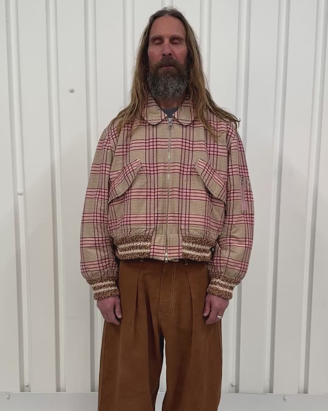 The Grain Bomber is an update on our Seed Bomber Jackets with a newly-added collar, made using a handwoven outer fabric, cotton lining and cotton wadding insulation. Other details include hand knit ribbed cuffs and hem, large front flap patch pockets and a two-way zip with custom branded zip pull.