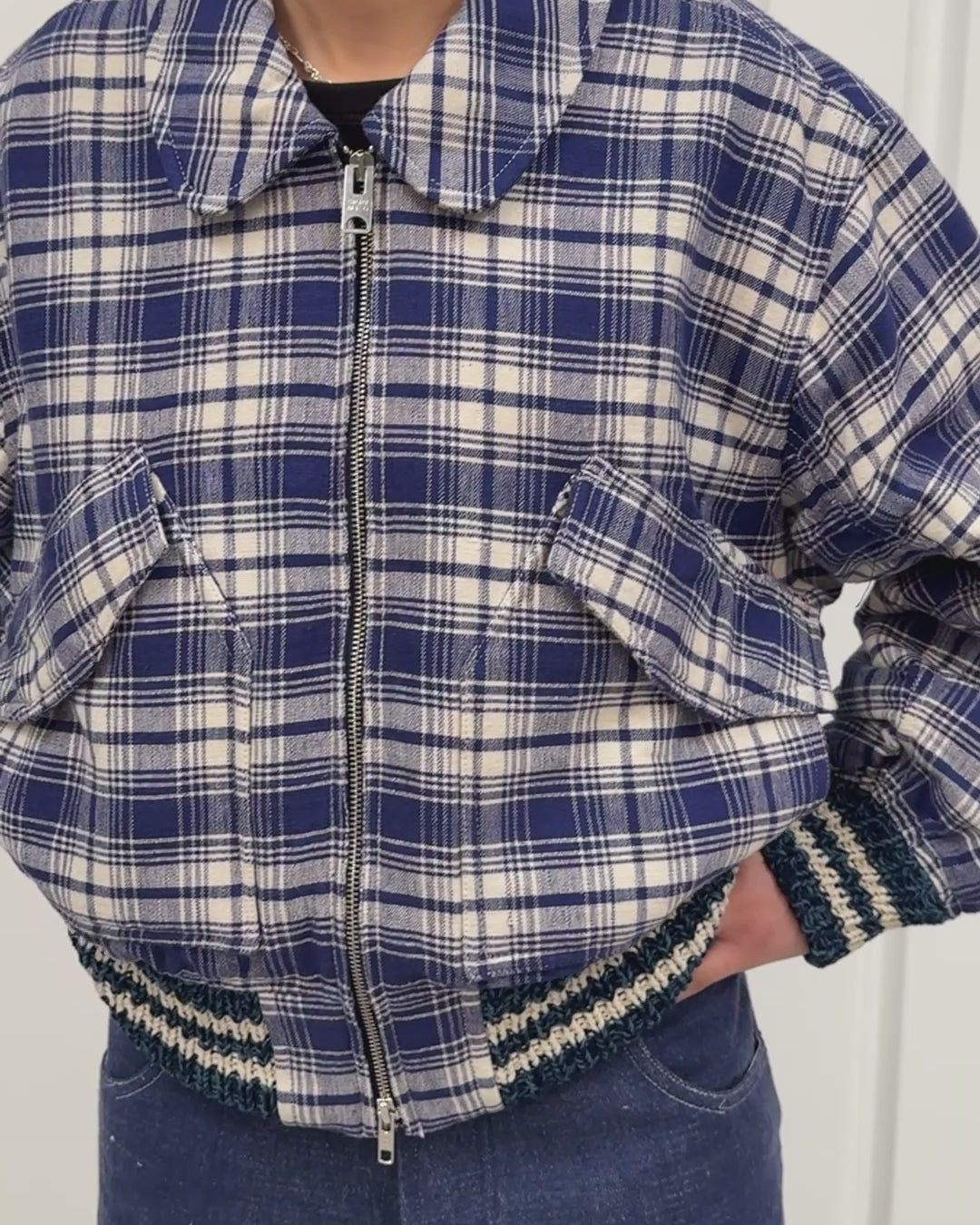 The Grain Bomber is an update on our Seed Bomber Jackets with a newly-added collar, made using a handwoven outer fabric, cotton lining and cotton wadding insulation. Other details include hand knit ribbed cuffs and hem, large front flap patch pockets and a two-way zip with custom branded zip pull.