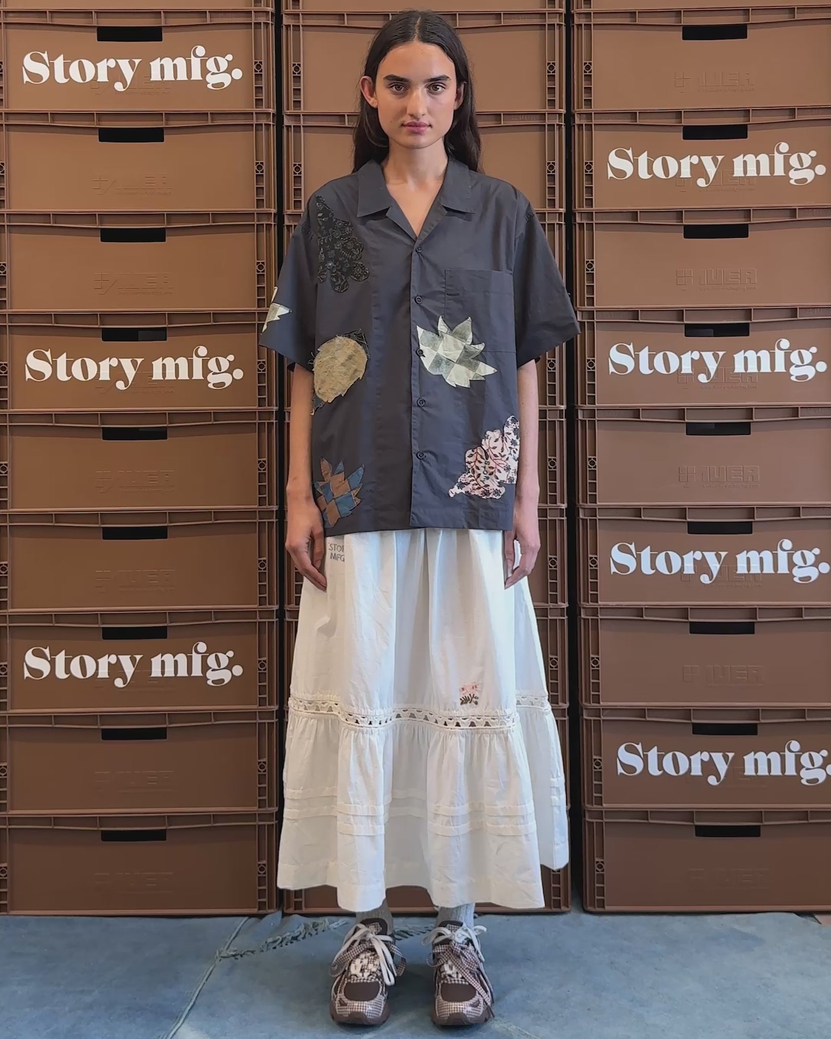 With a boxy fit inspired by bowling shirts, the short sleeve Greetings Shirt is made using an organic cotton and finished with leaf hand appliqué made from surplus fabric from previous seasons.