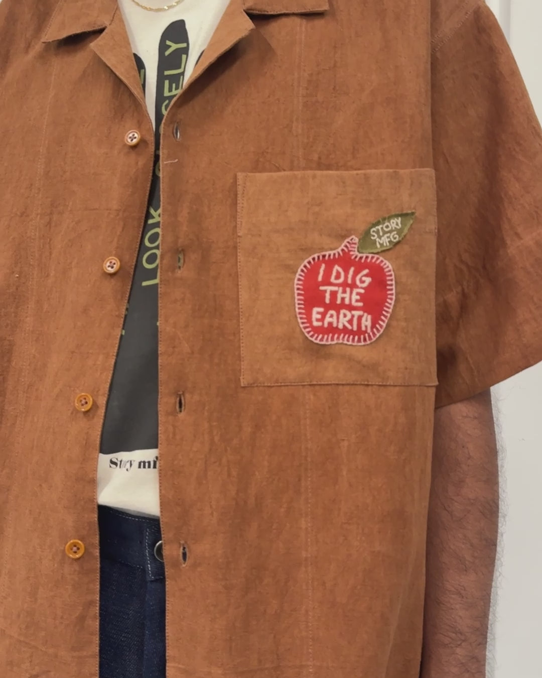 Our Greetings Shirt is cut from a cotton-linen blend with the slightly oversized, boxy fit of a retro bowling shirt. Details include a naturally dyed and hand embroidered apple patch on the chest pocket and naturally dyed corozo nut buttons.