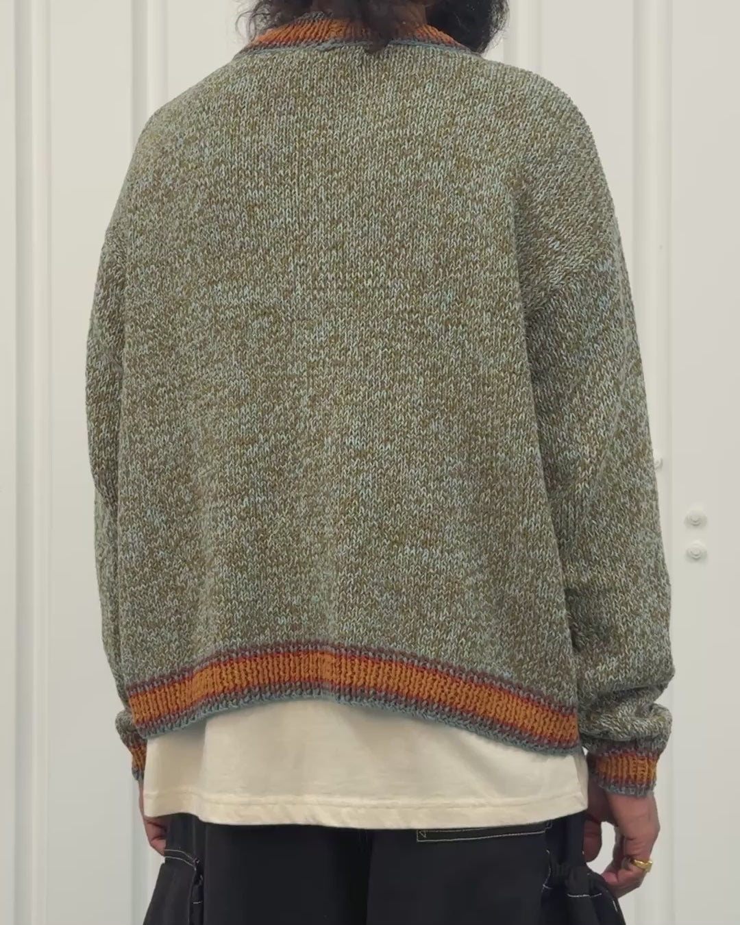 A heavy weight cardigan finished with a contrasting striped panel. The whole thing has been hand dyed using natural dyes and hand knit, meaning that it will look better and better as it ages.