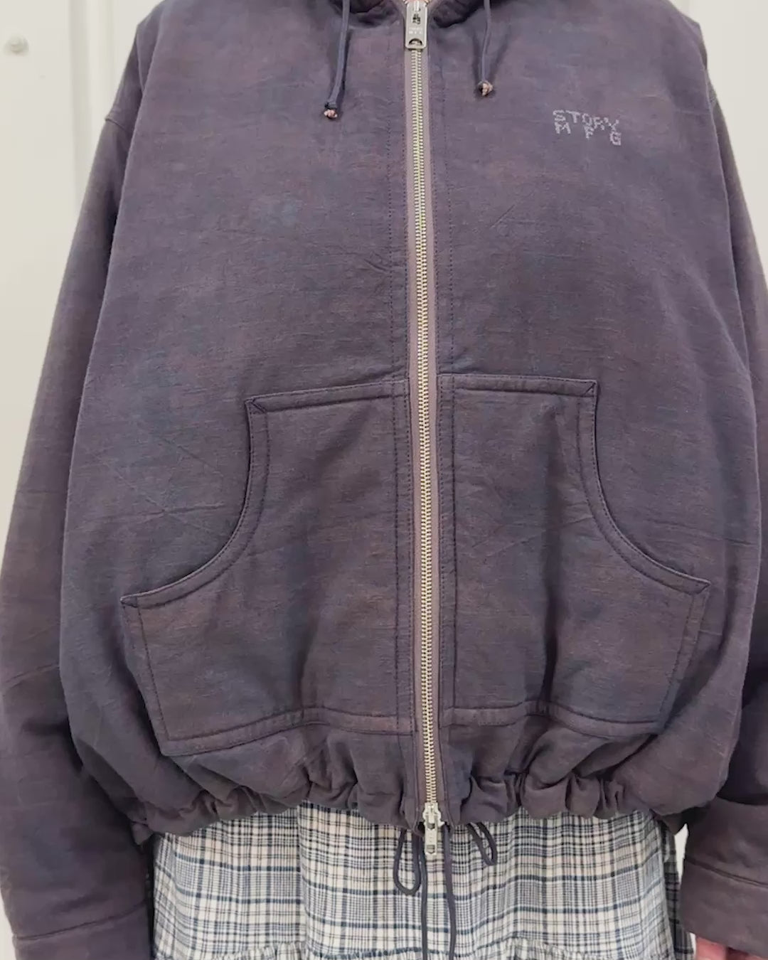A padded oversized workwear inspired hooded jacket made from a naturally dyed cotton canvas and 100% cotton wadding. Featuring a boxy fit with a two way zip, two front pockets and adjustable buttoned cuffs. Further details include hand embroidered cross stitch 'Story mfg.' logo on the chest, a drawcord for the hood and hem and internal pocket with zip closure.