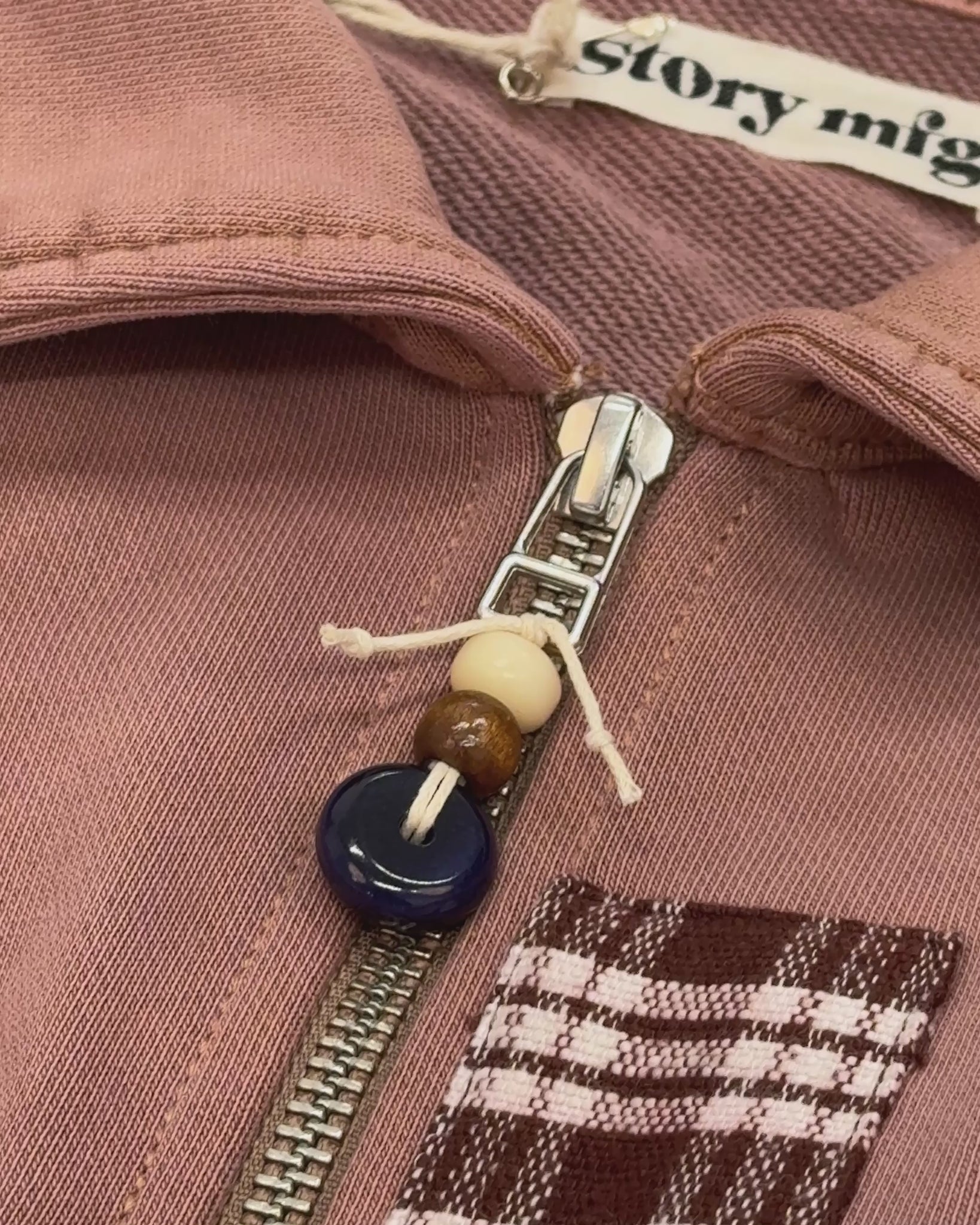 A heavyweight, 3/4 zip sweatshirt made from 100% organic cotton. The pullover comes with a boxy, slightly cropped fit inspired by vintage sweats, and is finished with a corozo nut bead pull and handwoven patches throughout.